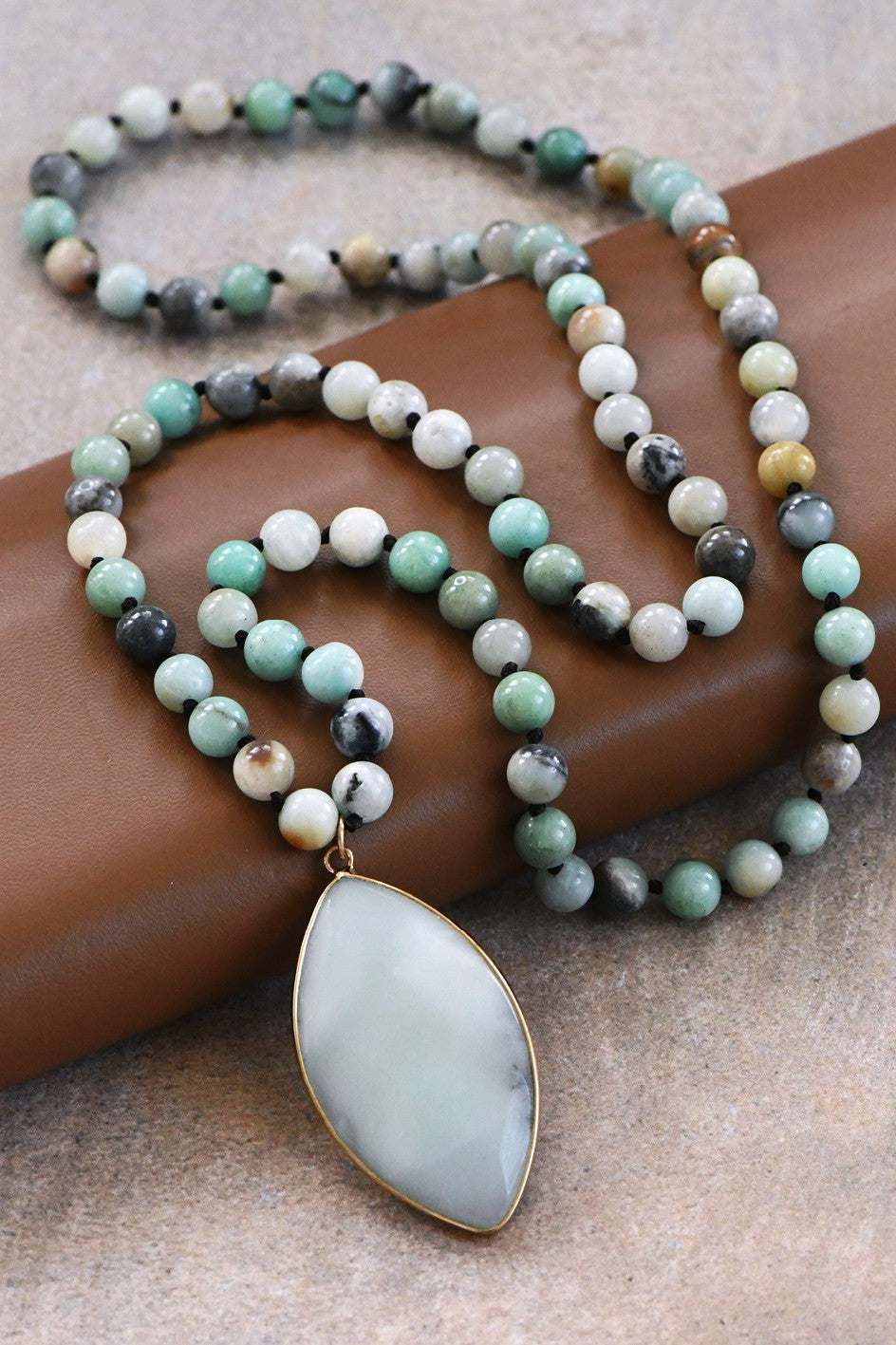 Elevate your everyday style with this striking semi-precious stone beaded necklace, featuring a captivating amazonite pendant that brings natural beauty to any outfit. The generous 34-inch length offers versatile layering options, while the substantial 1.25" x 2.26" pendant makes a confident statement without overwhelming your frame. Each piece is uniquely one-of-a-kind—the natural color variations and patterns ensure no two necklaces are identical, giving you an exclusive accessory that reflects your individual taste. Perfect for adding texture and earthy elegance to casual wear or dressing up your favorite ensemble.