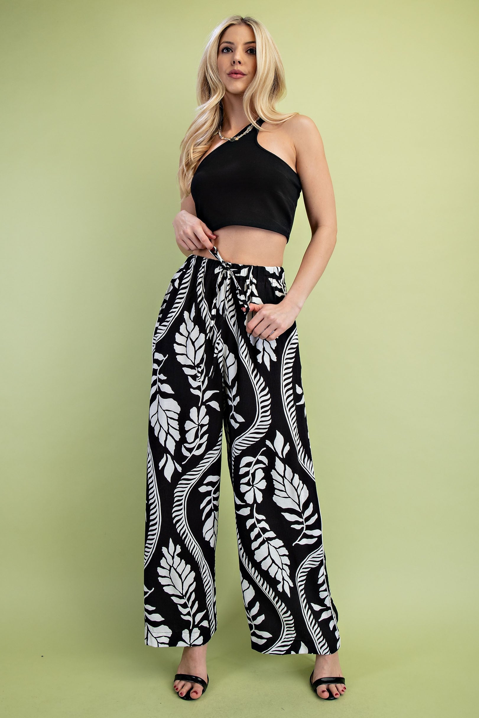 Effortlessly elevate your style with these Black/White Print Wide Leg Pants. The stunning print adds a touch of sophistication to any outfit, while the wide leg design provides both comfort and style. Made from high-quality materials, these pants are perfect for any occasion.