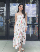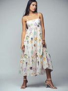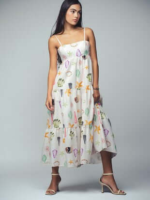 The empire waist design with straight neckline, adjustable spaghetti straps, and three-tiered skirt creates a flattering silhouette with breezy movement perfect for resort wear collections. - Exclusive watercolor seashell and starfish print pattern - Three-tiered design for added volume and movement - Straight neckline with adjustable spaghetti straps - Empire waist for a flattering, feminine silhouette - Lightweight woven fabric ideal for warm-weather styling
