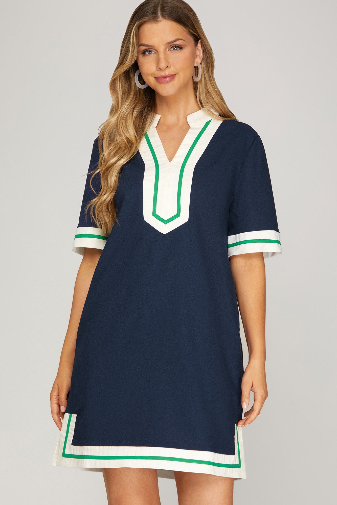 A classic shift dress with a sporty-chic twist. It’s a navy, short-sleeve silhouette with a relaxed, straight fit, accented by crisp white contrast trim and bold green piping. The split V-neckline and matching sleeve and hem detailing give it a polished, preppy feel—almost resort or country-club inspired. Clean lines, structured fabric, and a timeless color combo make it feel effortless, elevated, and versatile, perfect for everything from daytime events to casual dinners.