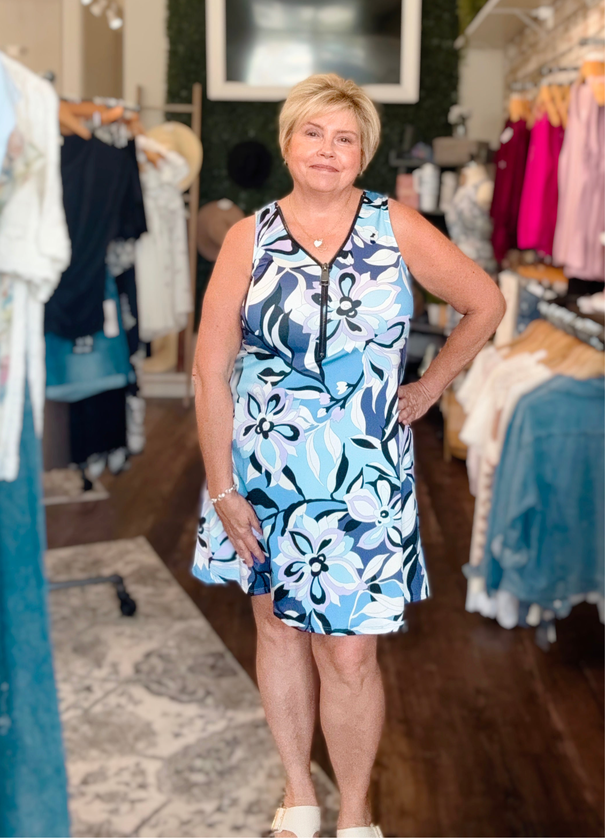 Combining effortless style and comfort. Its sleek zipper detail adds a modern edge, while the vibrant print ensures you stand out. Perfect for day-to-night wear, this dress offers a flattering fit that moves with you, making it an essential piece for any occasion.