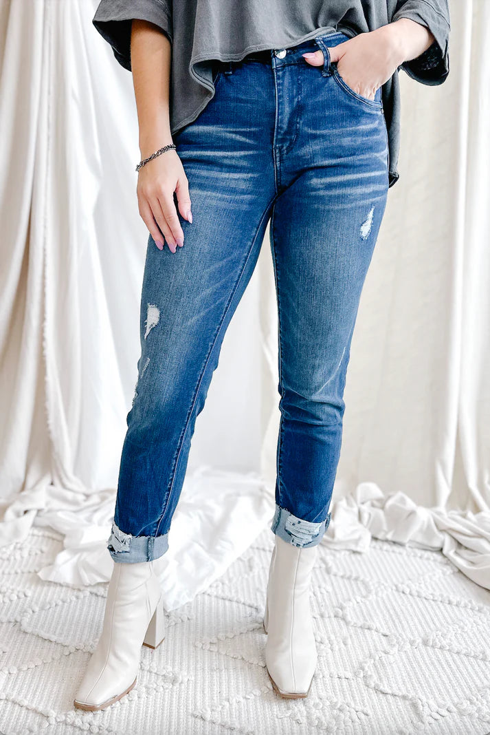 Mac and Me Straight Leg Girlfriend w/ Destructed Raw Cuff Hem