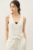 Crafted from breathable linen, it features a timeless button-down front with wooden buttons and a flattering V-neckline. The sleeveless design and relaxed fit offer ease of movement, while front welt pockets add practical detail. Its hip-length cut makes it perfect for layering or wearing alone, making this vest a versatile addition to any outfit.