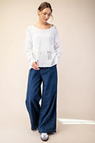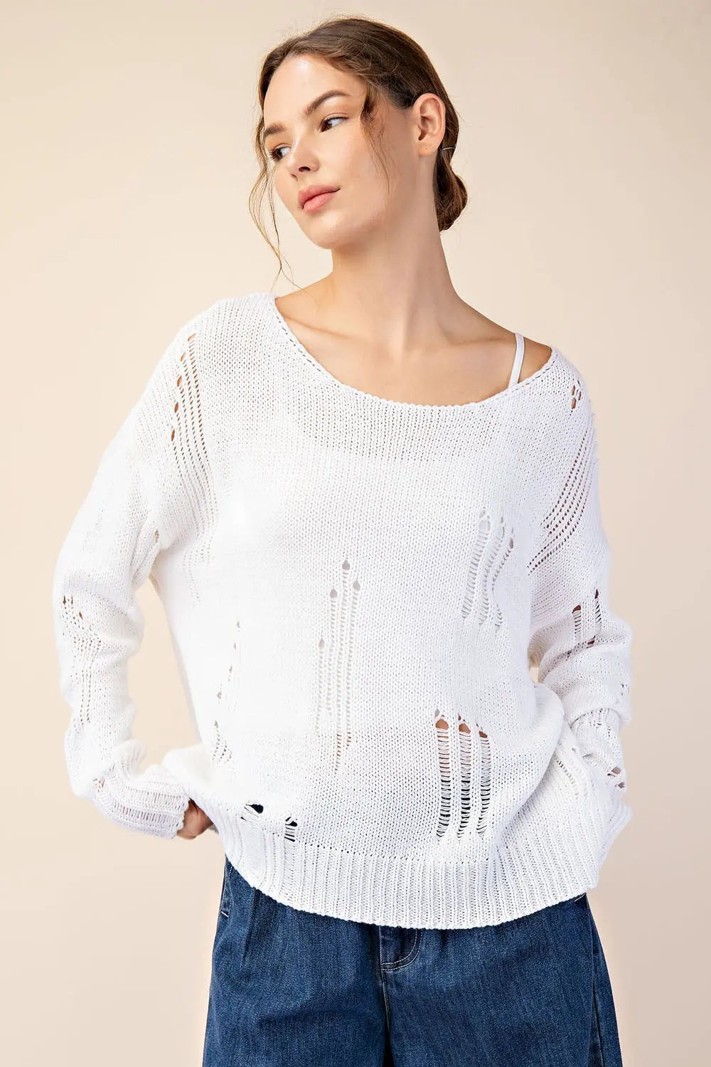 This off-white sweater combines comfort and style with a relaxed fit and subtle distressing throughout, adding an edgy touch. Its boat neckline offers a versatile cold shoulder look, while ribbed cuffs and bottom band ensure a snug, flattering fit. Perfect for layering or wearing solo, this sweater brings effortless cool to any outfit.