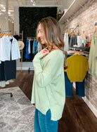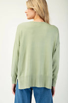 This long sleeve knit top in Dry Herb offers a perfect blend of comfort and style. Crafted from lightweight material, it features a flattering v-neckline, ribbed cuffs, and a ribbed bottom band that enhances fit. Side slits add subtle flair and ease of movement. Ideal for transitional weather, it effortlessly suits any occasion, making it a versatile addition to your wardrobe.