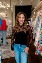 Long sleeve lace top featuring a slight mock neckline, two thumb holes and is a slightly fitted but relaxed silhouette.