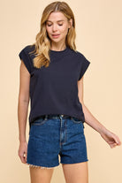 Designed for effortless style and comfort. Its relaxed fit and dropped sleeves create a modern silhouette that moves with you, perfect for both casual outings and chic layering. Crafted in a rich navy hue, this top pairs seamlessly with your favorite jeans or skirts, making it a versatile staple you'll reach for again and again. Experience the perfect blend of fashion and ease with this must-have addition to your collection.