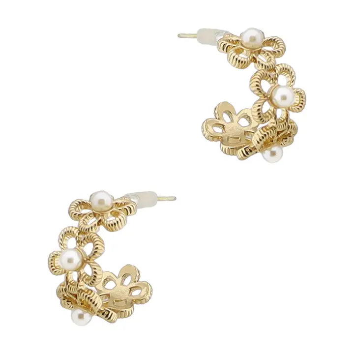 Delicate gold petals frame a lustrous pearl at the center of these charming open flower hoops. At just half an inch, they're the perfect size for everyday elegance—substantial enough to make a statement, yet refined enough to pair with any outfit. The warm glow of gold complements the pearl's natural radiance, creating a timeless piece that transitions seamlessly from day to night. Whether you're dressing up or keeping it casual, these earrings add a touch of sophisticated femininity to your look.