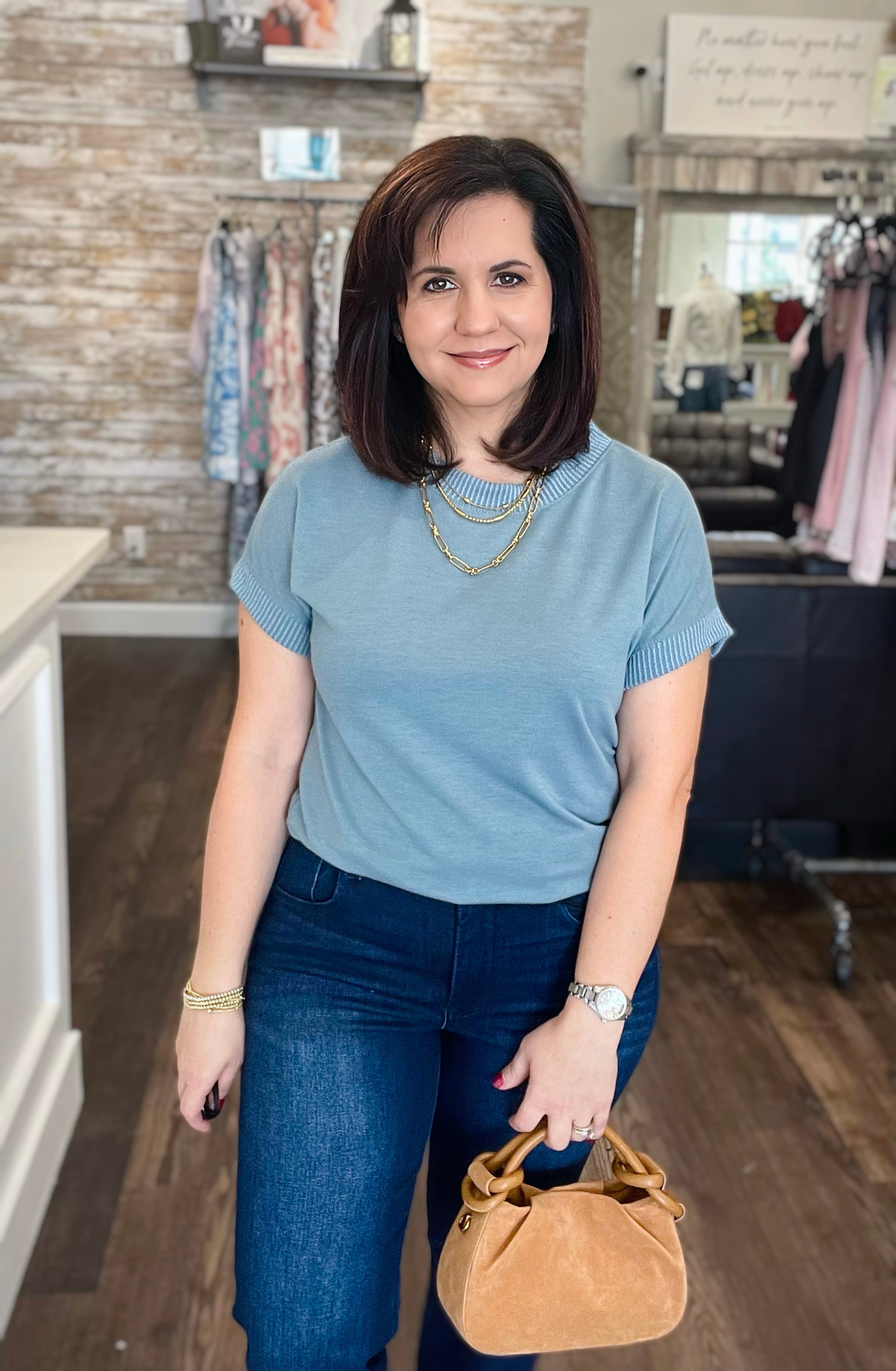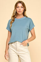 This blue steel short sleeve top features a textured knit trim along the round neckline and sleeve cuffs for subtle contrast. The relaxed fit and soft fabric provide all-day comfort, making it perfect for both casual and polished looks. Ideal for pairing with jeans, skirts, or trousers.