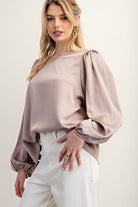 Solid satin long sleeve blouse top featuring a rounded neckline, buttoned cuffs, pinched shoulders and is a relaxed fit. Pair with any style bottoms for a casual but cute outfit!