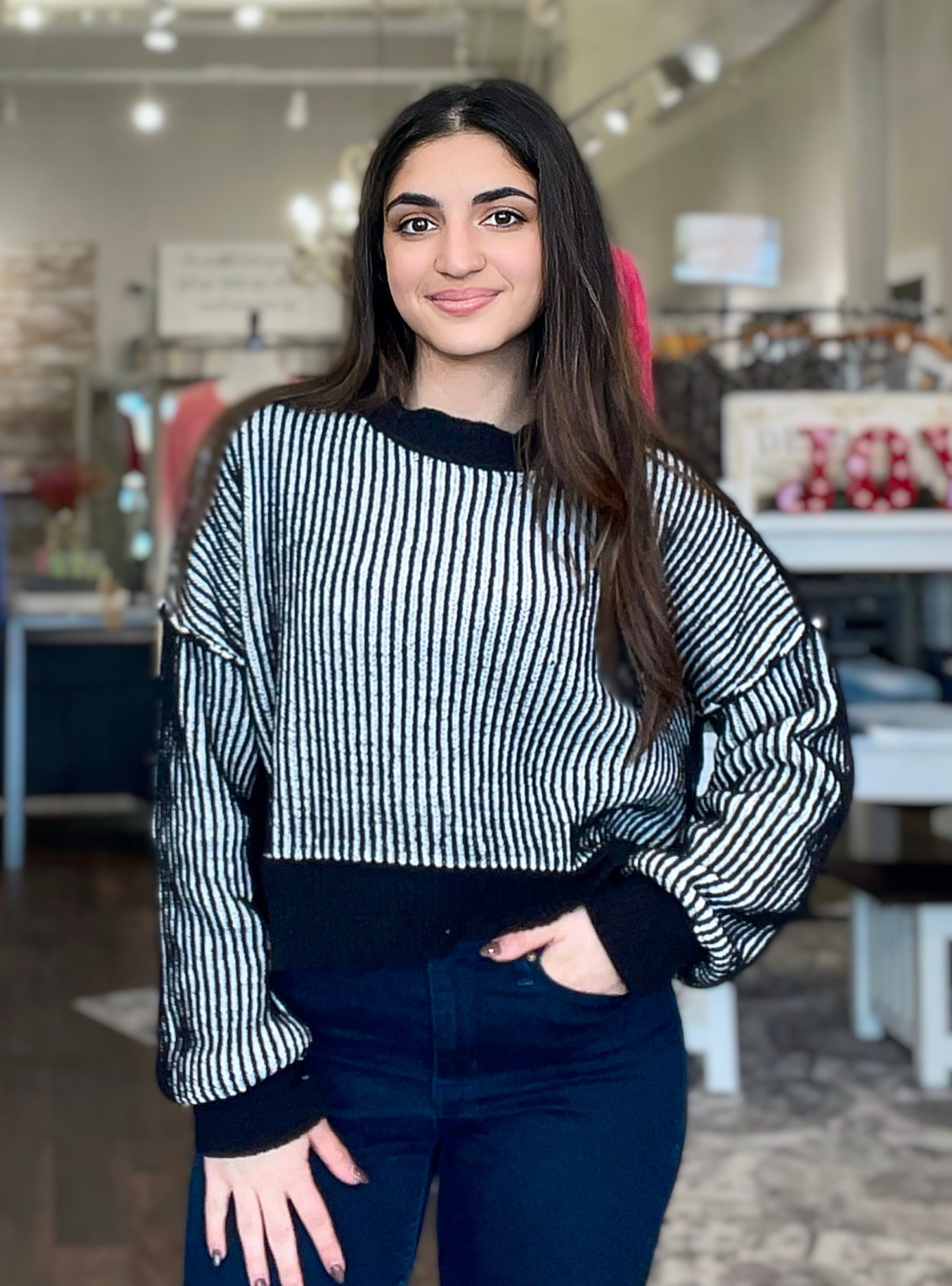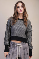 Effortlessly chic and undeniably comfortable, this two-tone striped sweater top brings relaxed sophistication to your everyday wardrobe. The oversized silhouette with drop shoulders creates a flattering, laid-back vibe, while the round neckline and long sleeves offer timeless appeal. Ribbed hems provide a polished finish that keeps the look intentional and put-together. Perfect for layering or wearing solo, this versatile piece transitions seamlessly from casual weekends to relaxed office days.