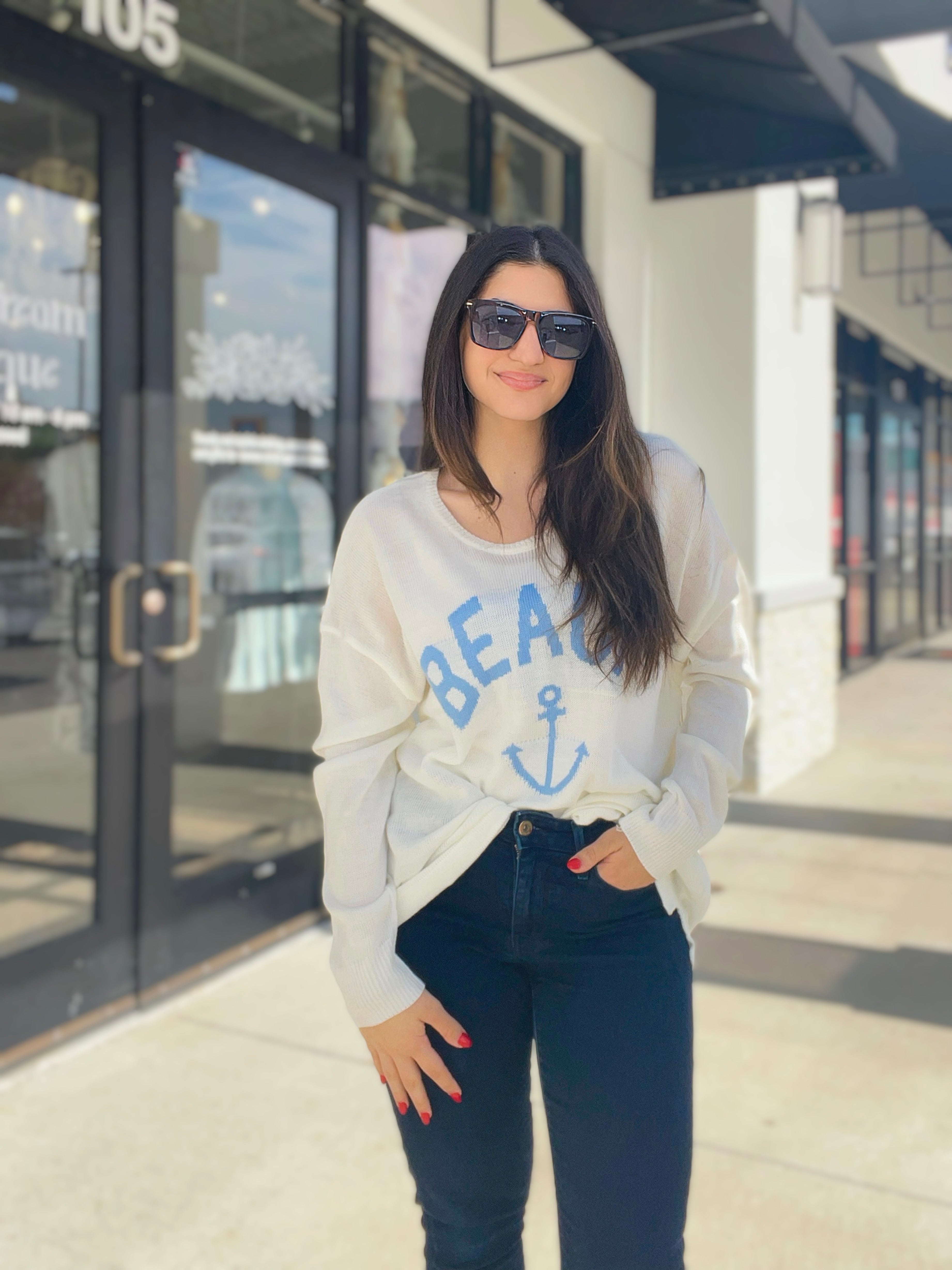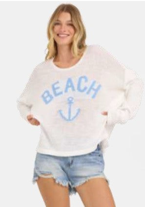 Capture the essence of a seaside escape with the Jacquard Anchor Sweater, a piece designed for the woman who loves the ocean breeze. This sweater features a vintage-inspired jacquard design, showcasing a bold "BEACH" script and anchor graphic in a soft serenity blue.