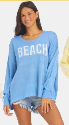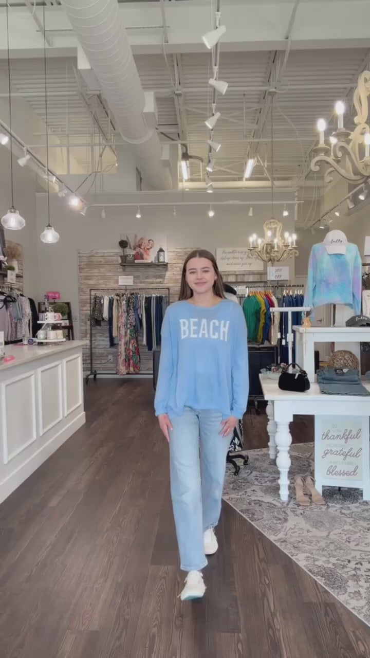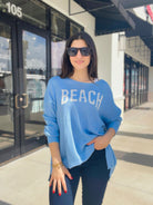 The standout jacquard design showcases a bold, block-letter "BEACH" graphic, with select styles featuring a timeless anchor motif for an extra nautical touch. Whether you're opting for the crisp white with sky-blue accents or the ocean-blue with white lettering, this sweater offers a semi-sheer finish that layers beautifully over your favorite swimwear or a simple camisole.