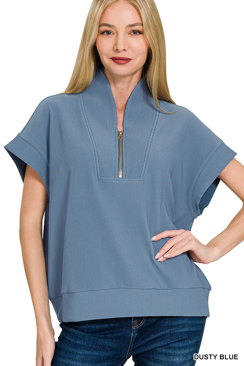 A sleek, modern staple for your wardrobe, this Ribbed High Neck Half Zip Top combines comfort with contemporary style. Crafted from a soft, stretchy ribbed fabric, it hugs the body for a flattering fit while allowing ease of movement. The high neckline adds a touch of sophistication, and the half-zip detail lets you adjust the look—wear it zipped up for a polished feel or slightly open for a relaxed vibe. Perfect for layering or wearing on its own, this top transitions effortlessly from casual days to chic evening outings.