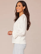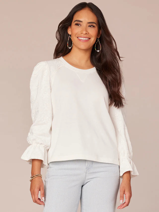 Chic meets effortless. This 3/4 sleeve top features delicate flounce cuffs and a mixed media design that adds subtle texture and dimension. The lightweight fabric makes it perfect for layering or wearing solo, while the timeless silhouette pairs effortlessly with denim, trousers, or skirts. A versatile piece you can dress up for work or style casually for everyday wear.