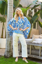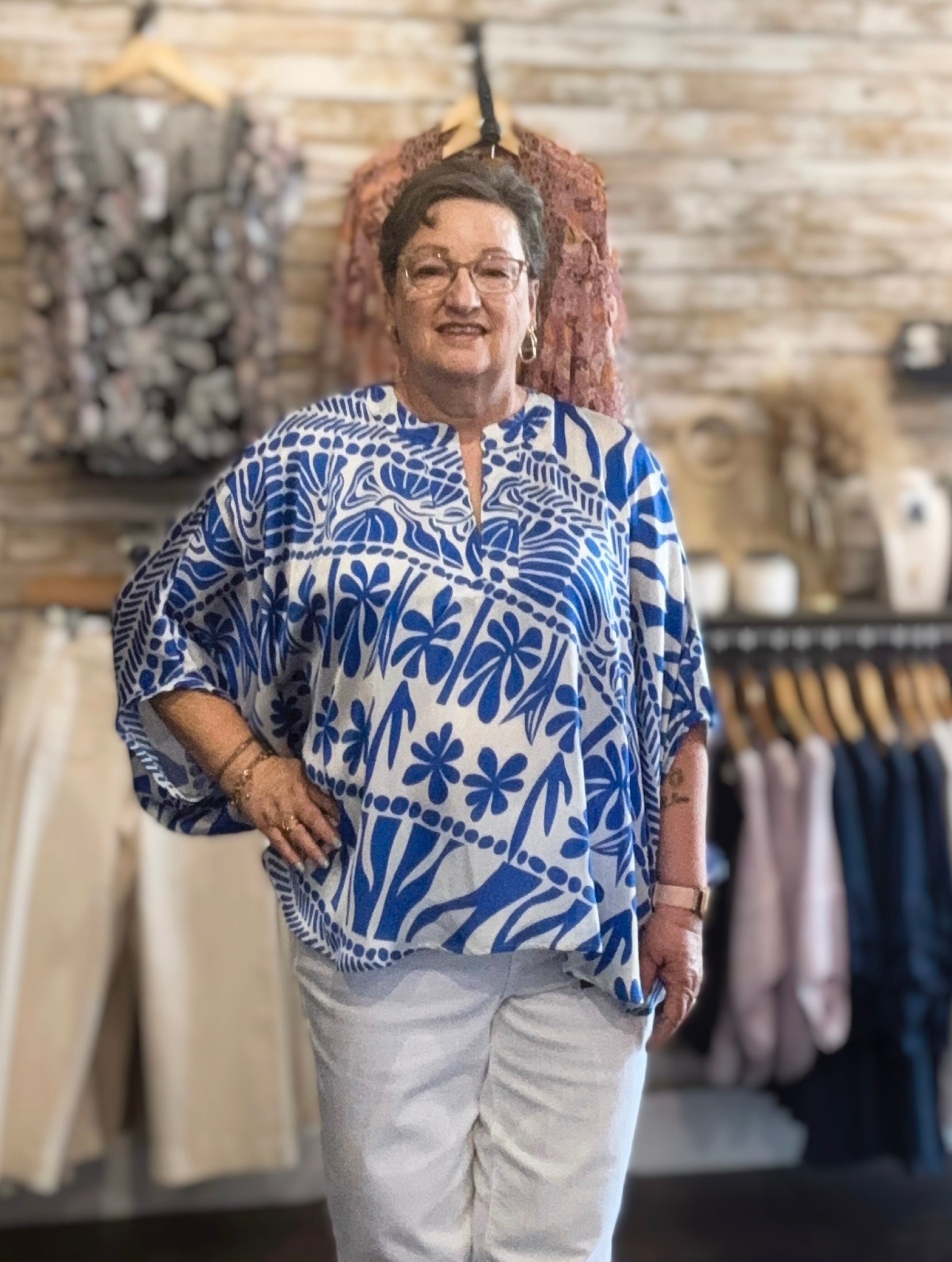 This Blue Printed Silky V-neck Top is the perfect addition to your wardrobe. Its vibrant print adds a playful and unique touch to any outfit, while the silky material provides a luxurious feel. Ideal for any occasion, this top will make you stand out in style.
