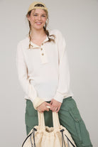 Keep it casual and stylish in this round-neck Henley top featuring a half-button neckline and unique patchwork details. Designed with long sleeves and a relaxed fit, this ribbed knit top combines comfort with effortless everyday style — perfect for layering or wearing on its own for a cozy, laid-back look.