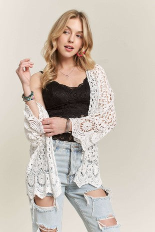 Indulge in elegance with our Crochet Cardigan with Scallop Hem. This cardigan features intricate crochet detailing and a delicate scallop hem, elevating any outfit with a touch of sophistication. Perfect for layering during cooler months or as a statement piece in warmer weather. Add it to your wardrobe today!