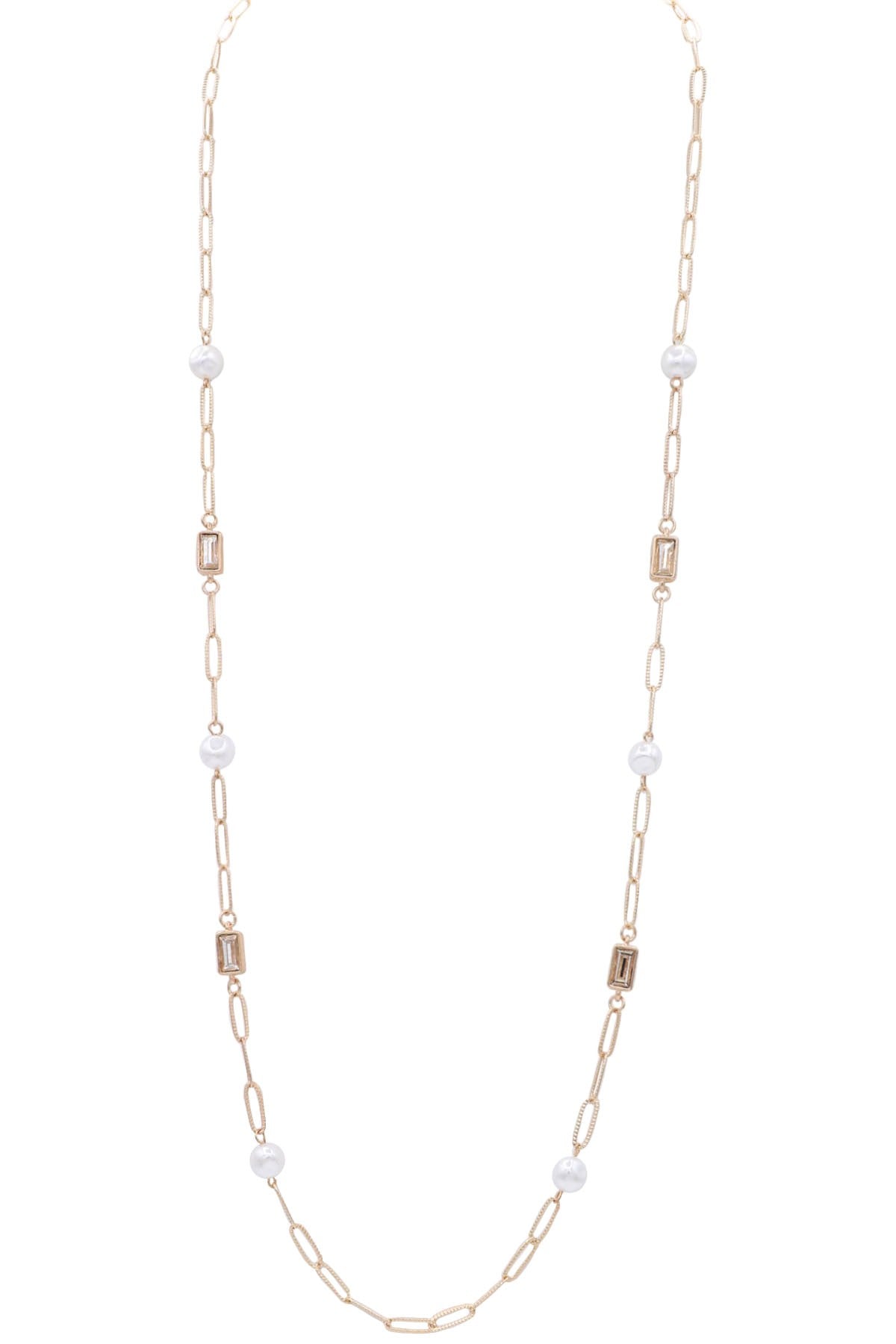Its graceful design adds a touch of sophistication to any outfit, whether casual or formal. The lustrous pearls paired with shimmering stones create a captivating contrast, making it an ideal accessory to enhance your neckline. Lightweight and versatile, this necklace is perfect for layering or wearing solo to make a subtle yet striking statement. Add timeless charm and refined beauty to your jewelry collection with this exquisite piece.