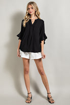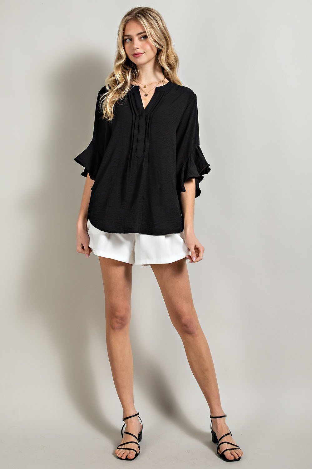 Ruffled Bell Sleeve Front Pleated Detail Top Black